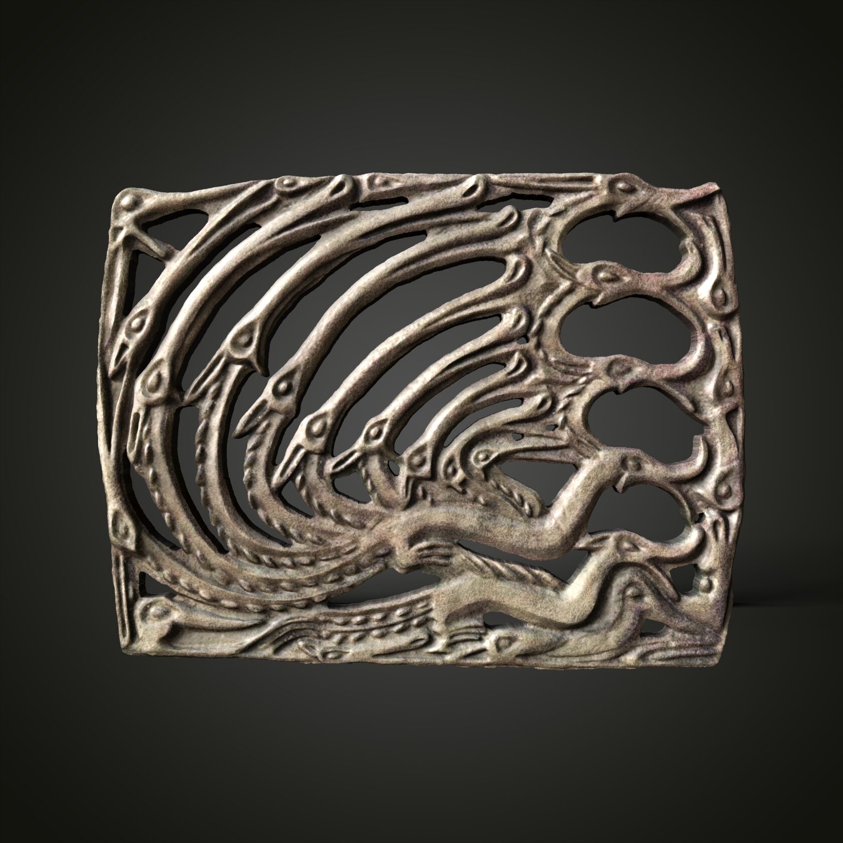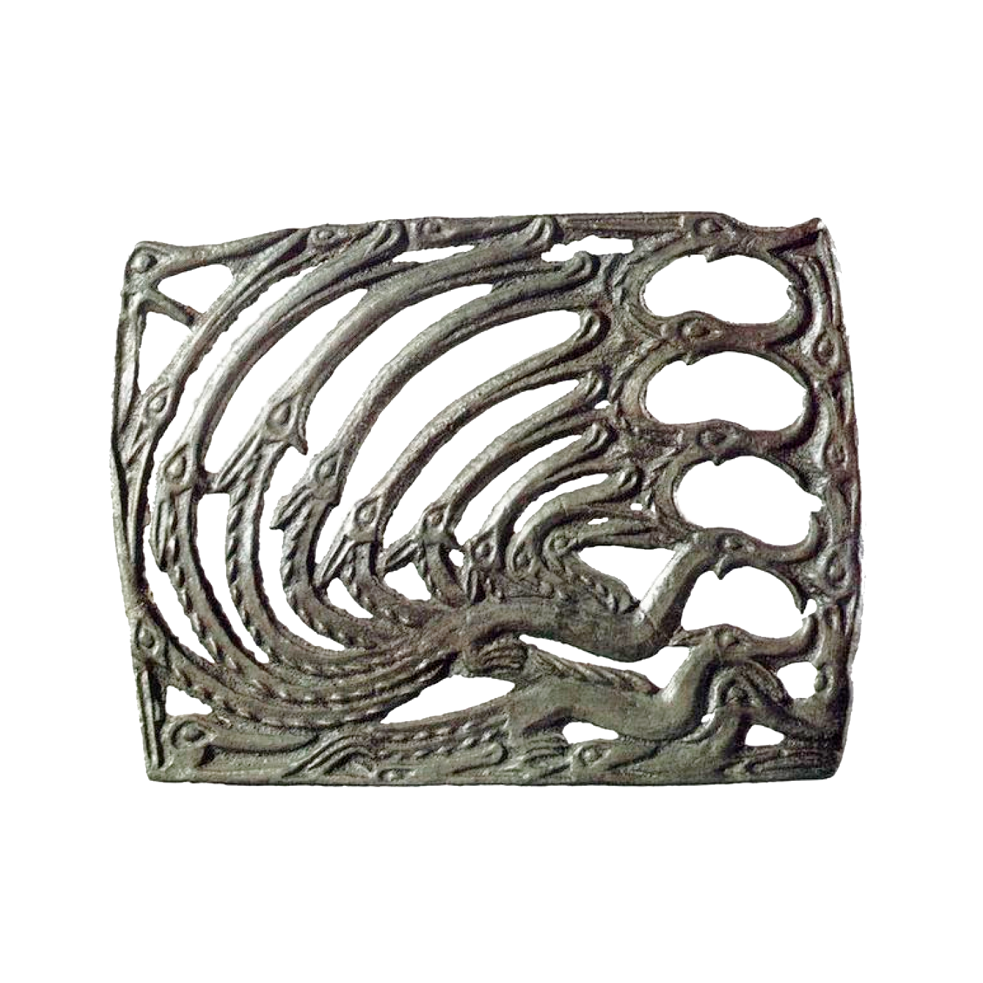 Ажурная бляха с летящими птицами и поднятыми вверх лосиными головами. VII—VIII вв. (р. Ухта, Коми АССР).