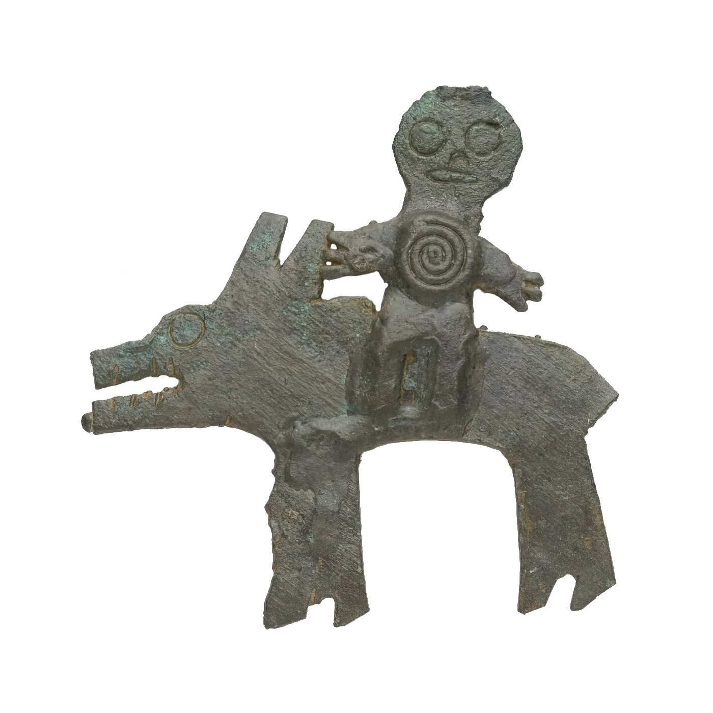Божество на волке. Окрестности г. Пермь, Гляденовское костище III—V вв. Гляденовская культура Прикамья. Бронза.