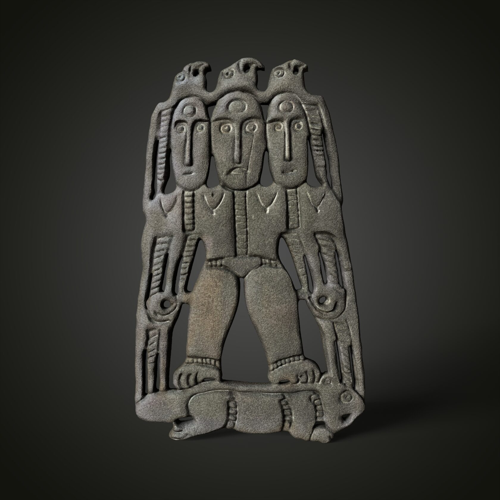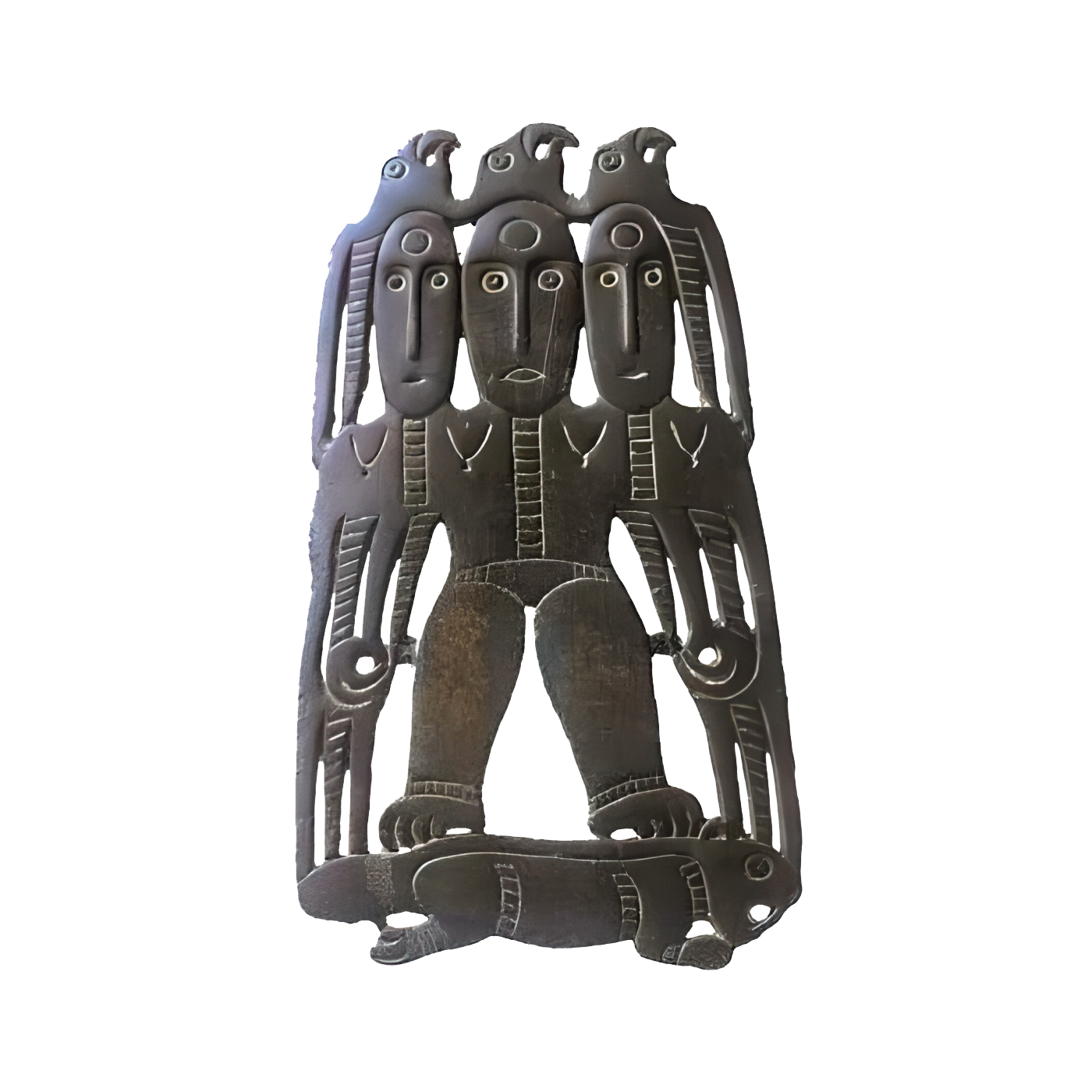 Прорезная бляха. VIII—IX вв. Один из интереснейших вариантов так называемого космогонического сюжета. Крылатая трехликая богиня стоит на ящере. Над каждым ликом — по грифону. Найдена вместе с другой бляхой (д. Усть-Каиб Чердынского района, Пермской области). Бронза, литье, 164×90 мм.